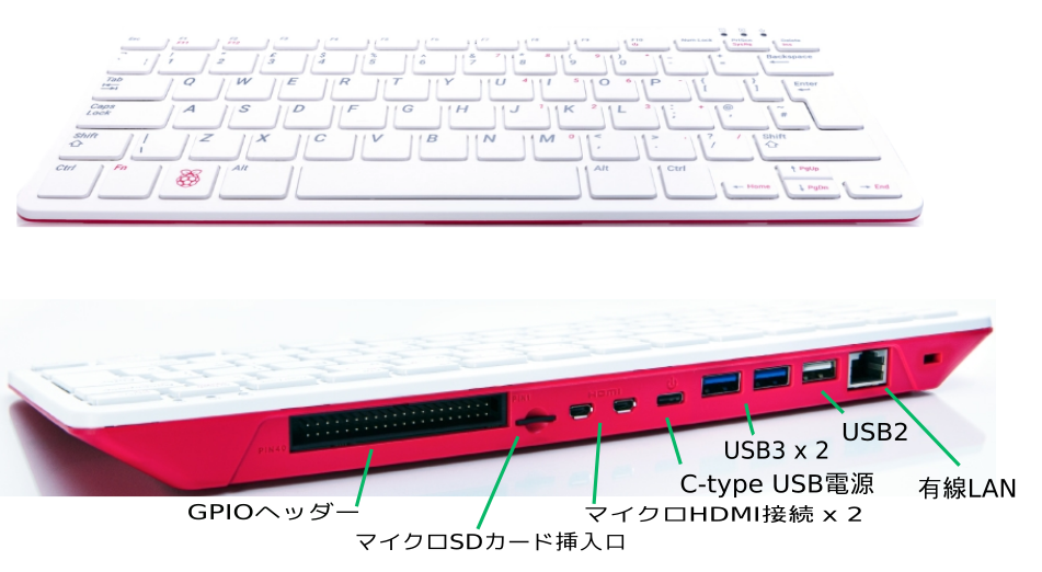 当教室で使用しているラズパイはRaspberry Pi 400(キーボードパソコン)またはRaspberry Pi 4