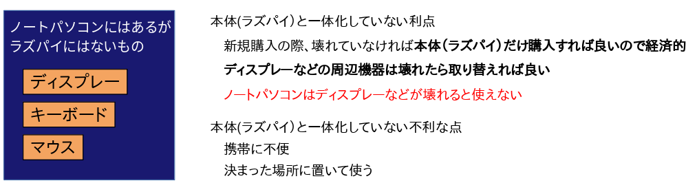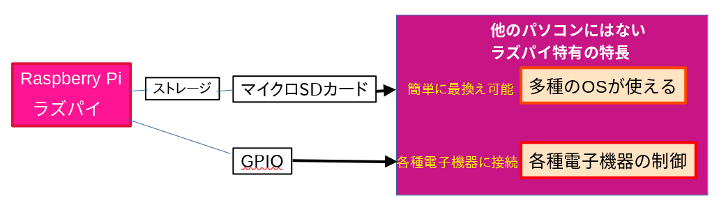 | ラズパイ特有の機能 | GPIO ピン、各種インターフェース(上図参照) |